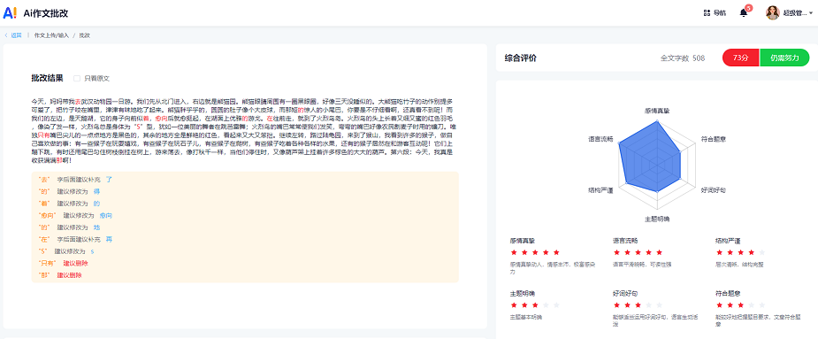 教学辅助是该平台的又一个重要功能模块,该模块旨在有效减轻教师批改作业等教辅工作的压力。以模块中的作文批改为例,线下的作文批改是一项繁琐的任务,需要消耗大量的时间和精力,我们利用人工智能中的大模型技术,实现了快速作文评分功能,精准定位学生写作薄弱项,指明学生个性化提升方向;实现了文章的润色功能,大幅降低个性化辅导的实践难度,优化一线教师工作量,助力教师高效辅导;实现了AI写作指导功能,能自动解析作文题目、核心观点,拓展学生知识面,补充素材库参考资料,启发学生想象力和创造力,培养学生自主学习能力,帮助学生快速提升。教学辅助模块不仅能够提升教师的教学效率,还能够为学生提供更精准的个性化学习方案。