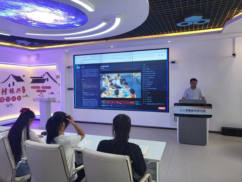 在我国第39个教师节来临之际,人工智能教育研究院负责人刘斌,向参观的济南市章丘区部分中小学的老师,介绍了研究院深化产教融合,联合武汉东信同邦公司等企业在人工智能、大数据应用方面所做的研究工作,展示了国内领先的人工智能+教师教育研修的建设成果。