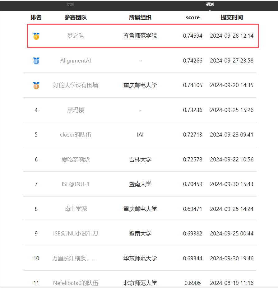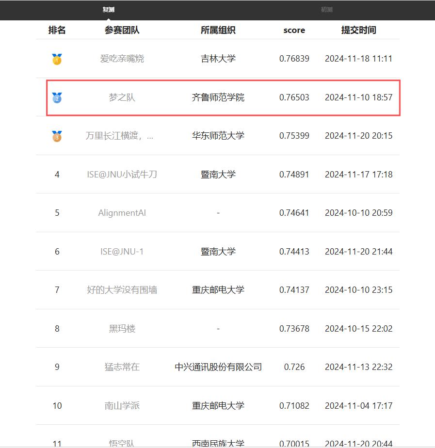人工智能教育研究院接到学校通知后迅速行动,由李成飞等多位教师带领人工智能专业的本科生,组建了6支师生队伍参与此次竞赛。从6月到9月的初赛阶段,我们的科研团队严格按照比赛要求,不断提交和优化参赛模型。炎热的暑假,团队成员们放弃了休息时间,全力以赴,最终在第二赛道(多模态试题知识点标签预测)中荣获全国第一名的佳绩,并且有三支队伍成功晋级复赛。