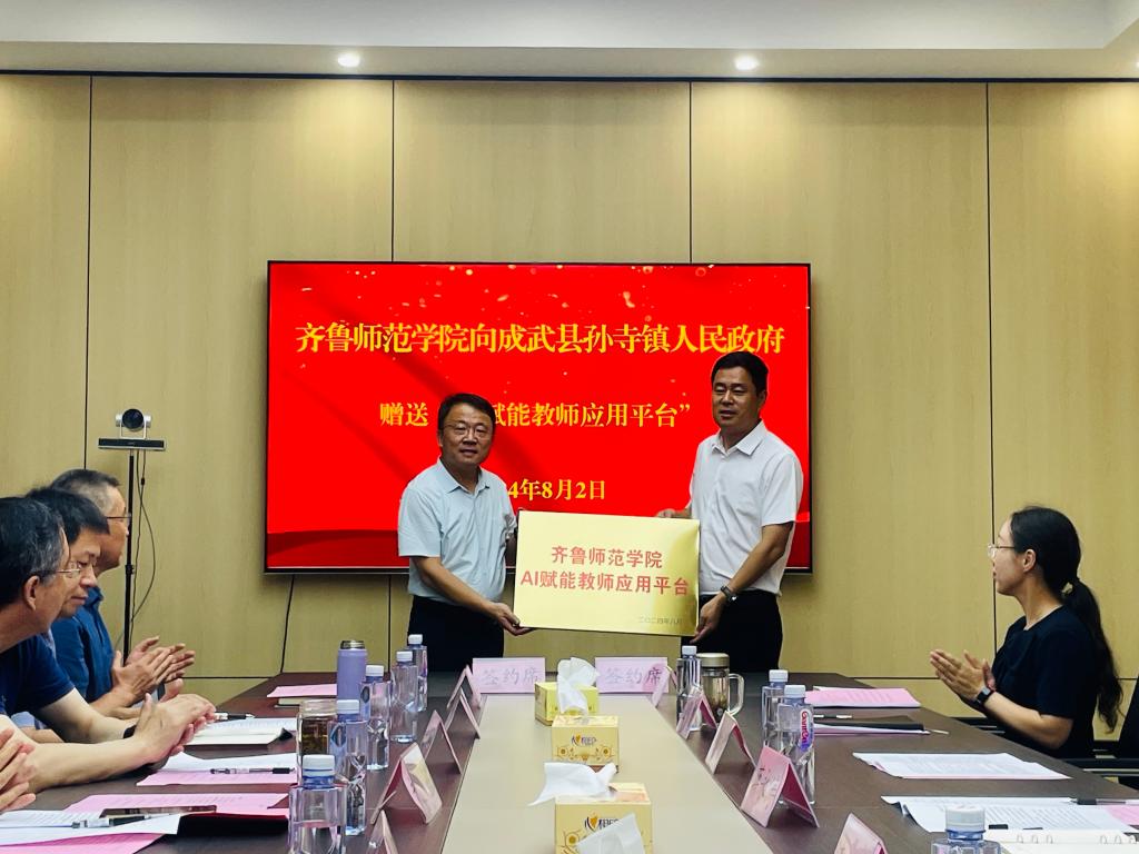 人工智能教育研究院负责人刘斌向成武县孙寺镇捐赠由我校自主开发的“AI赋能教师应用平台试用权”。通过该平台可以帮助实现智能化课堂评价、学生学习过程全面评估等功能,为教师提供精准的指导和优化意见。